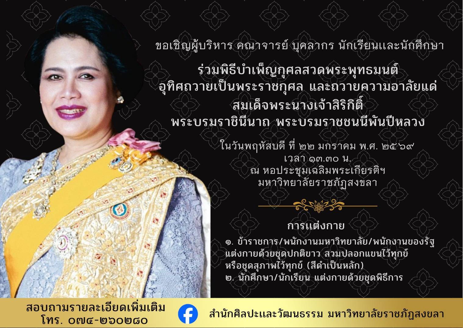 ขอเชิญร่วมพิธีบำเพ็ญกุศลสวดพระพุทธมนต์อุทิศถวายเป็นพระราชกุศล และถวายความอาลัยแด่สมเด็จพระนางเจ้าสิริกิติ์ พระบรมราชินีนาถ พระบรมราชชนนีพันปีหลวง